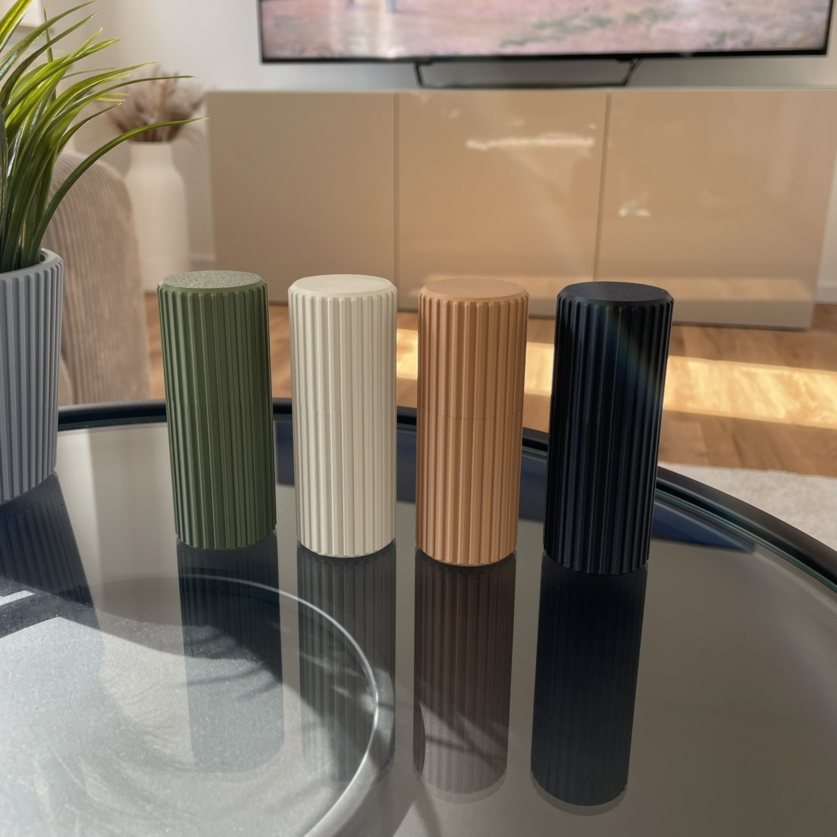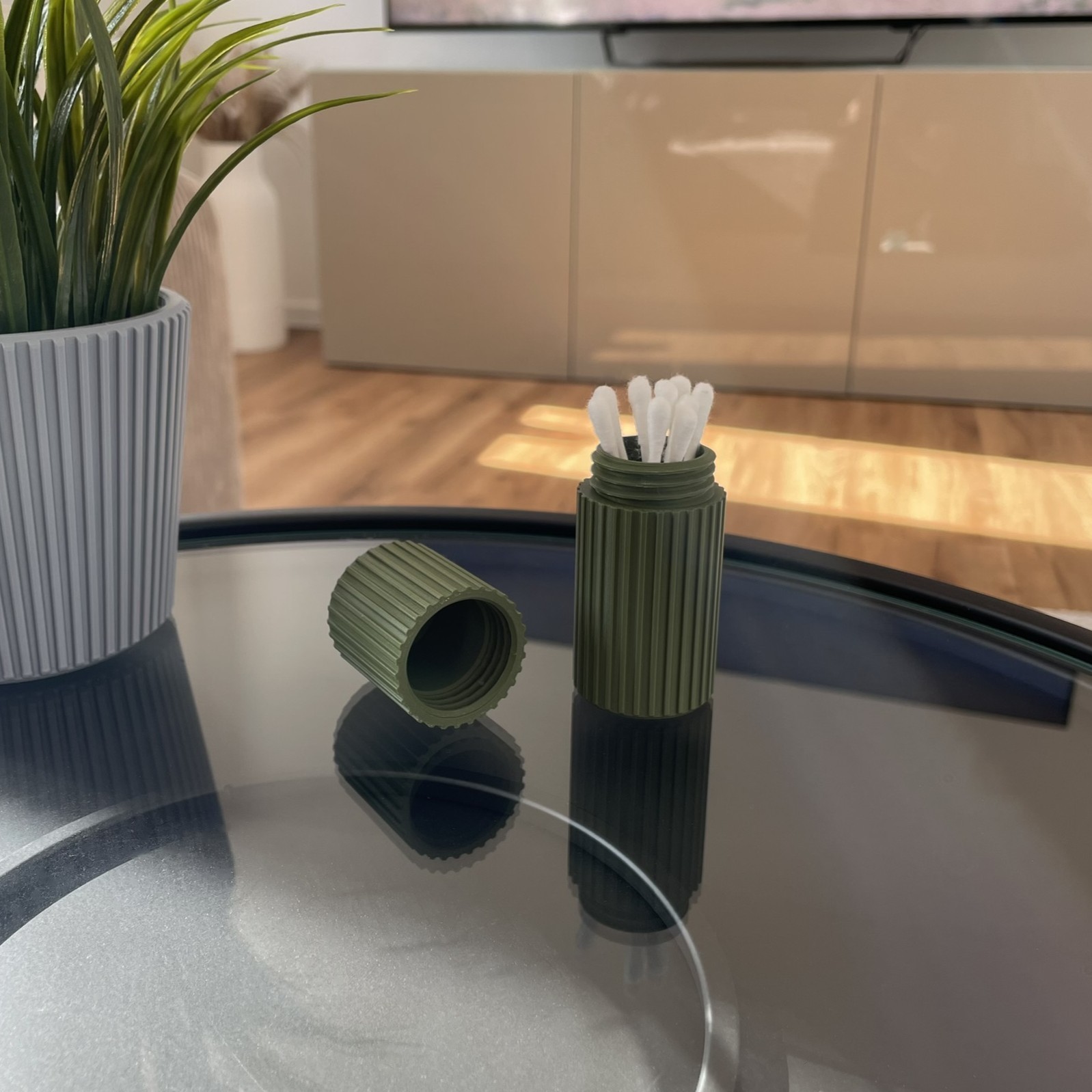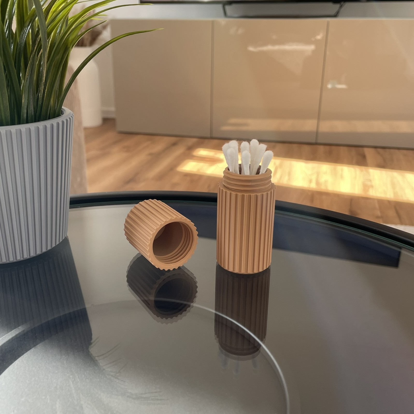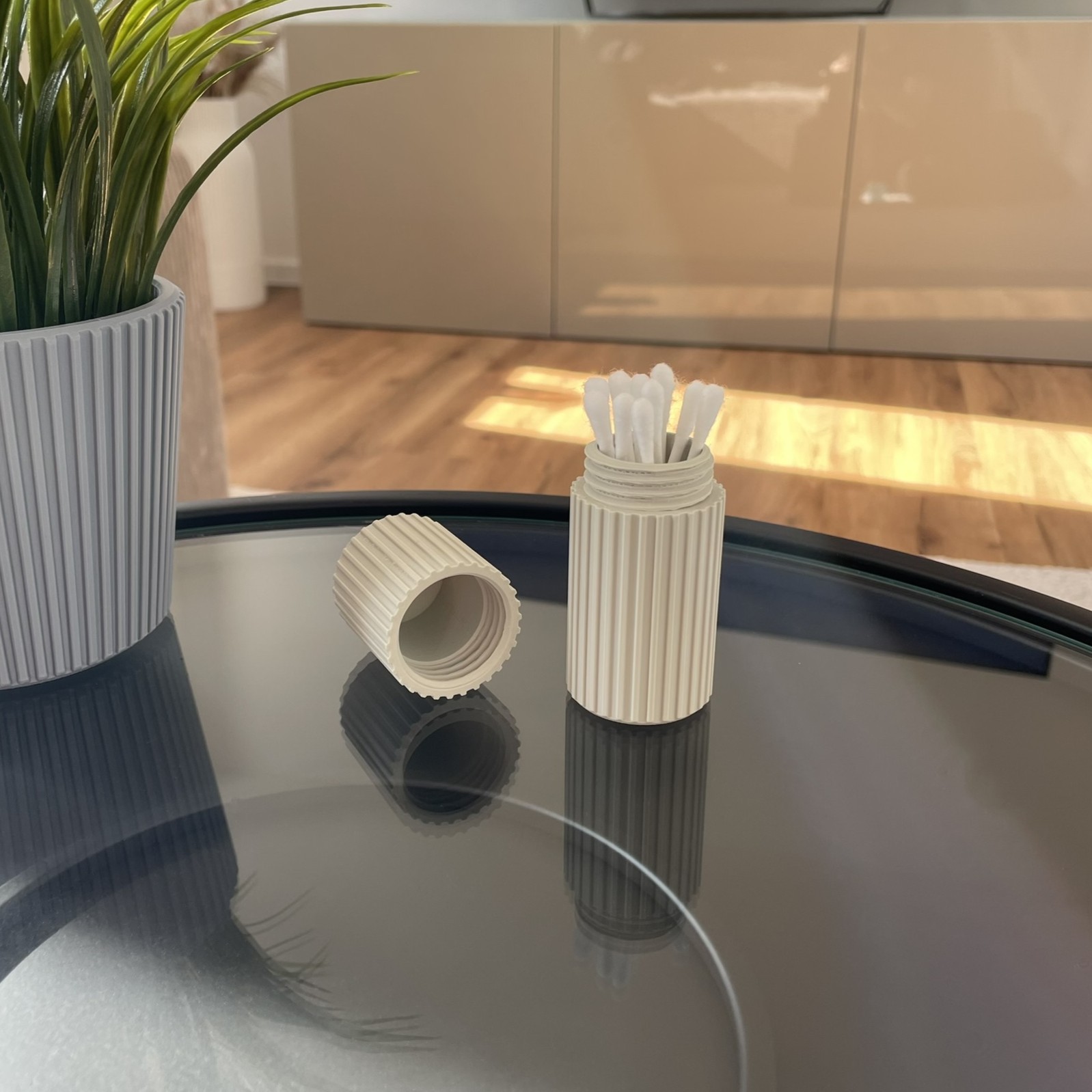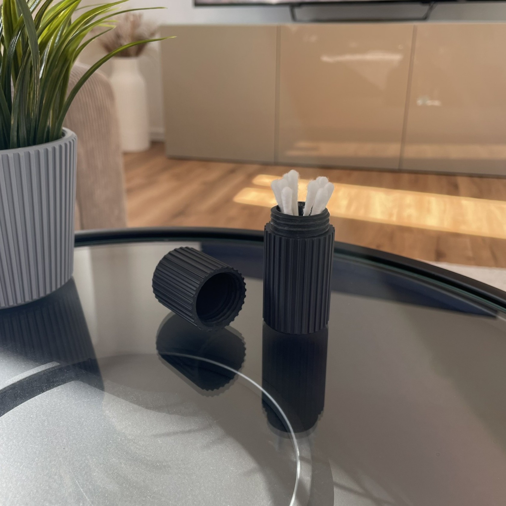 Schlichte Aufbewahrungsdose mit Schraubverschluss für kleine Gegenstände wie Wattestäbchen oder ähnliche Utensilien. Kompakte, zylindrische Form mit feiner Linienstruktur für eine ruhige, moderne Optik im Bad oder Wohnbereich.