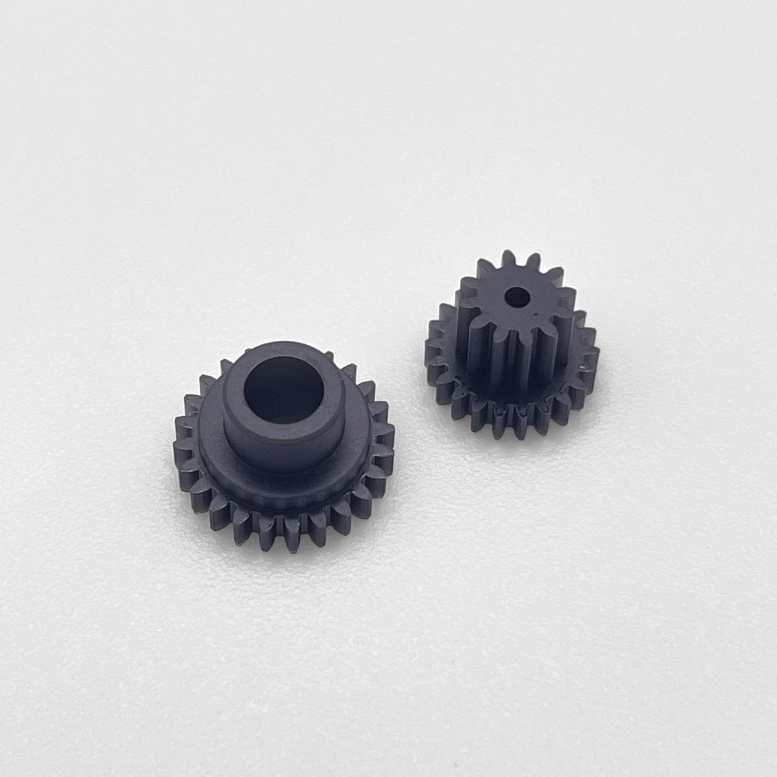 Beide Zahnräder wurden im CAD-Programm konstruiert und anschließend im SLA-Verfahren aus schwarzem, ABS-ähnlichem Kunstharz gefertigt. Das Verfahren gewährleistet eine hohe Detailtreue und das Material bietet eine robuste Grundlage, wodurch die Zahnräder für den Einsatz im Modellgetriebe geeignet sind.