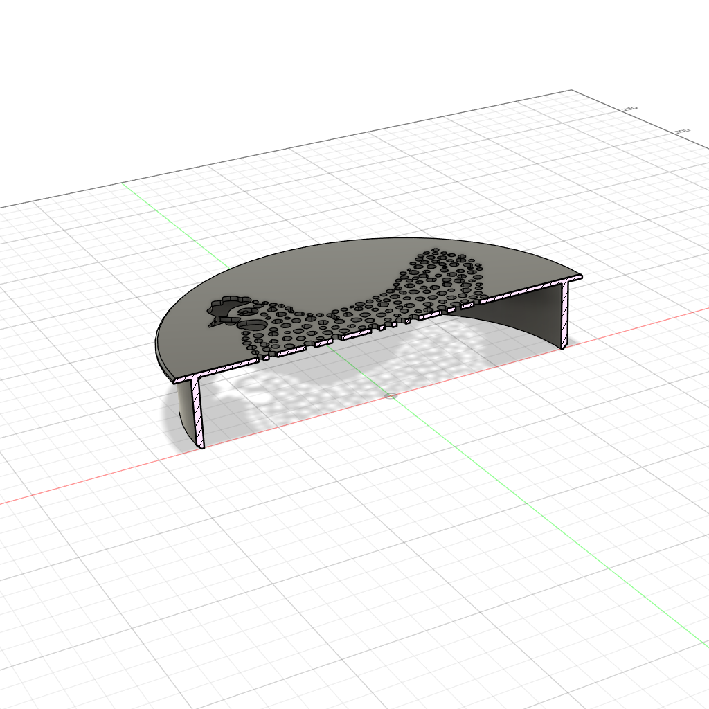 Das Modell wurde zunächst in einem CAD-Programm konstruiert. Das Motiv selbst entstand mithilfe KI-gestützter Bildgenerierung und wurde anschließend in das Modell übertragen. Gefertigt wurde die Abdeckung im FDM-Verfahren aus umweltfreundlichem, mattschwarzem PLA.
