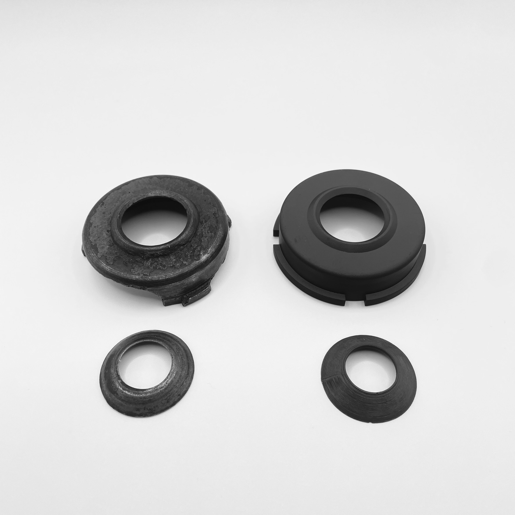 Die originale Distanzscheibe mit einer Dicke von ca. 0,5 mm verursachte Spiel in der Konstruktion. Daher wurde auch hiervon ein CAD-Modell erstellt und die Dicke auf 1,5 mm erhöht. Die Fertigung erfolgte im FDM-Verfahren unter Verwendung eines schwarzen, flexiblen und widerstandsfähigen Kunststoffs.