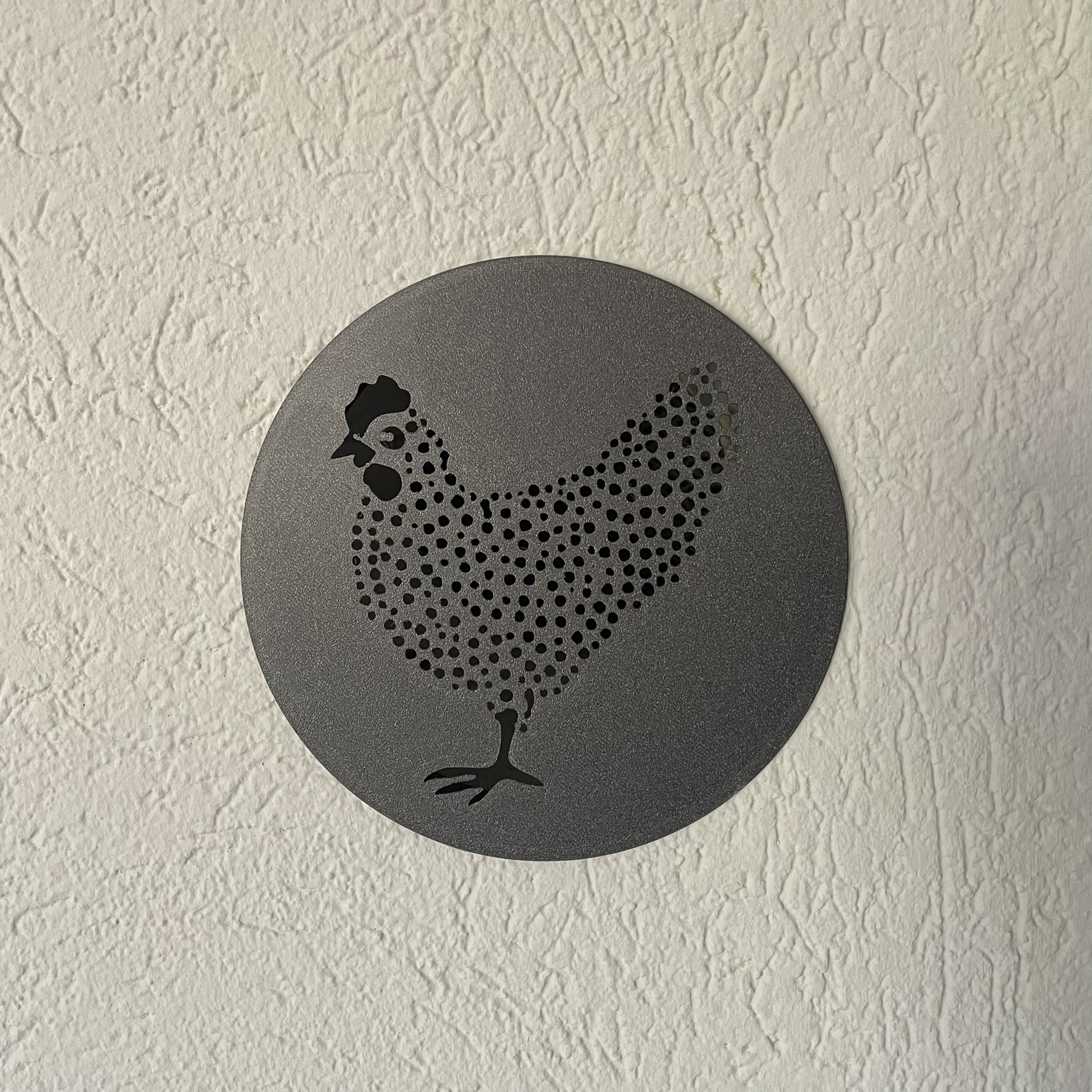 Die Abdeckung ist als runde Scheibe ausgeführt, die passgenau in das Loch eingesetzt werden kann. Zur Gestaltung wurde zusätzlich ein Motiv in Form eines Huhns integriert.