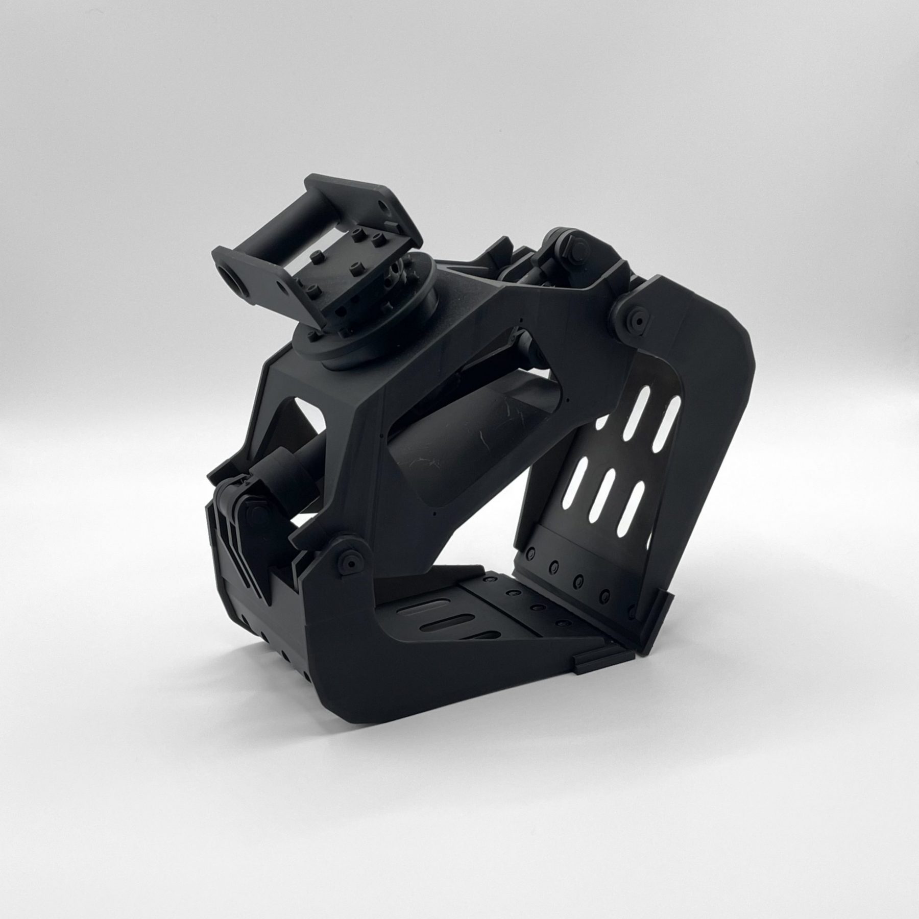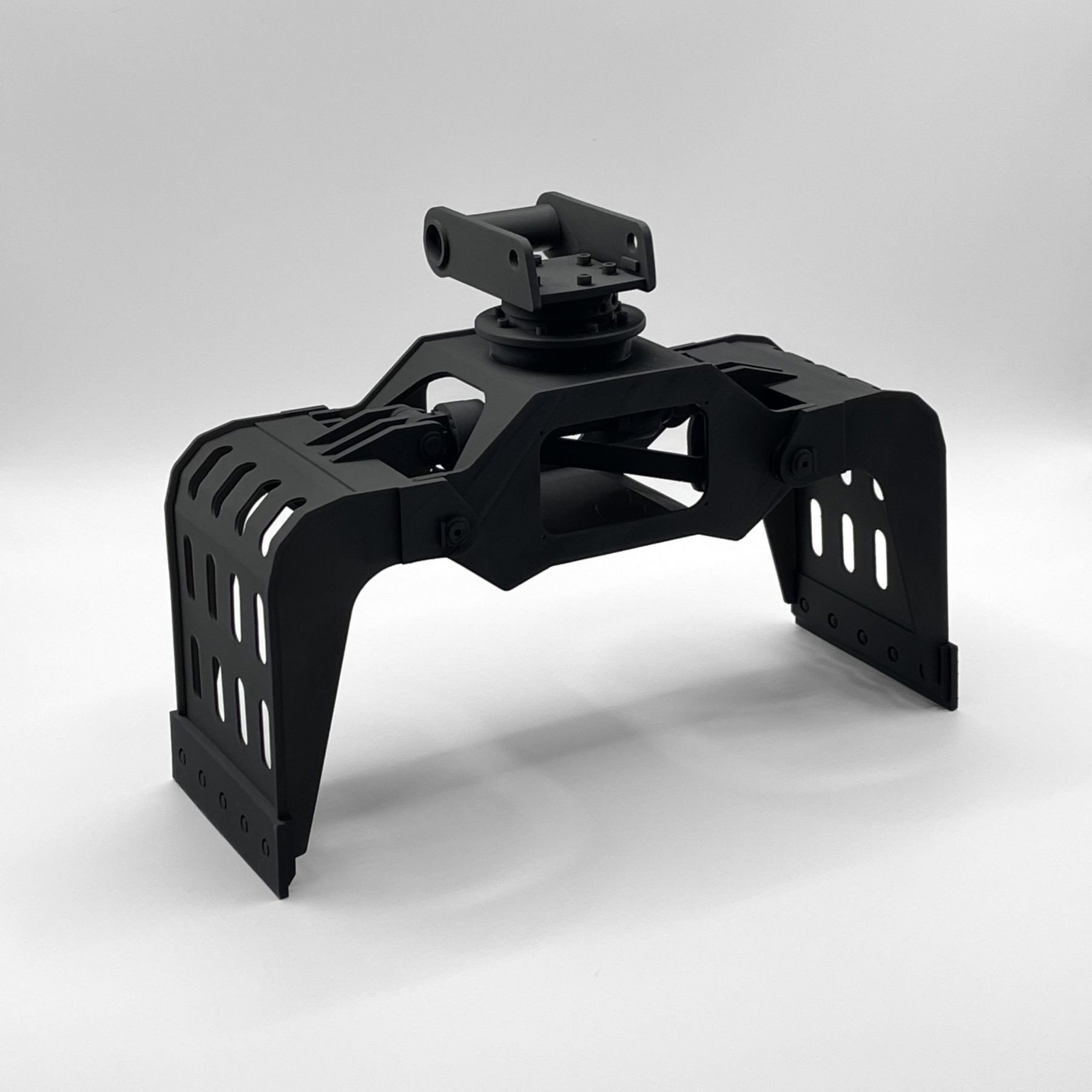 Zur Veranschaulichung entstand ein Modell im Maßstab 1:12, gefertigt im SLA-Verfahren aus schwarzem, ABS-ähnlichem Kunstharz. Die Toleranzen der Bolzenverbindungen wurden so angepasst, dass die Greifbewegung im Modell funktionsfähig dargestellt werden kann.