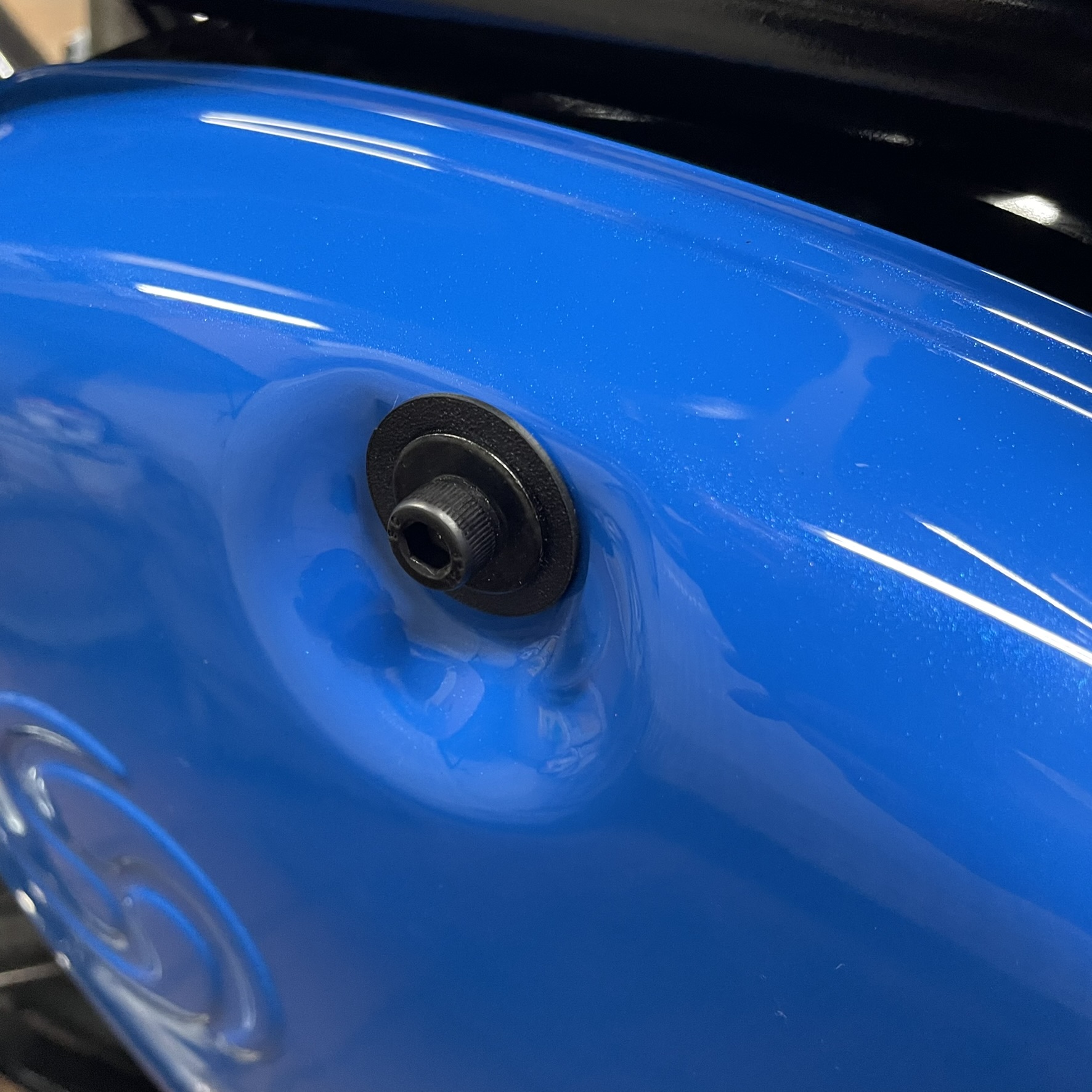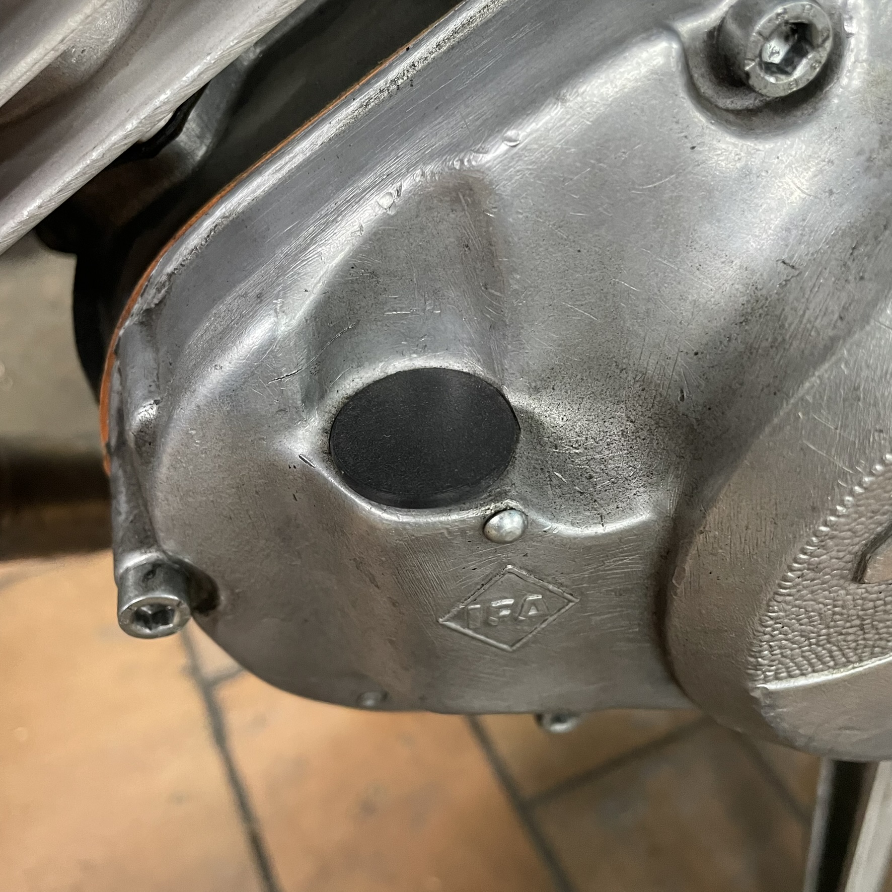 Diese 16-mm-Bohrung in dem Motorgehäuse der Simson S51 dient dem Drehzahlmesser. Da dieser bei diesem Umbau nicht mehr benötigt wird, wurde die Öffnung mit einem eigens konstruierten Verschluss verschlossen. So wird zuverlässig verhindert, dass Fremdkörper ins Innere gelangen.