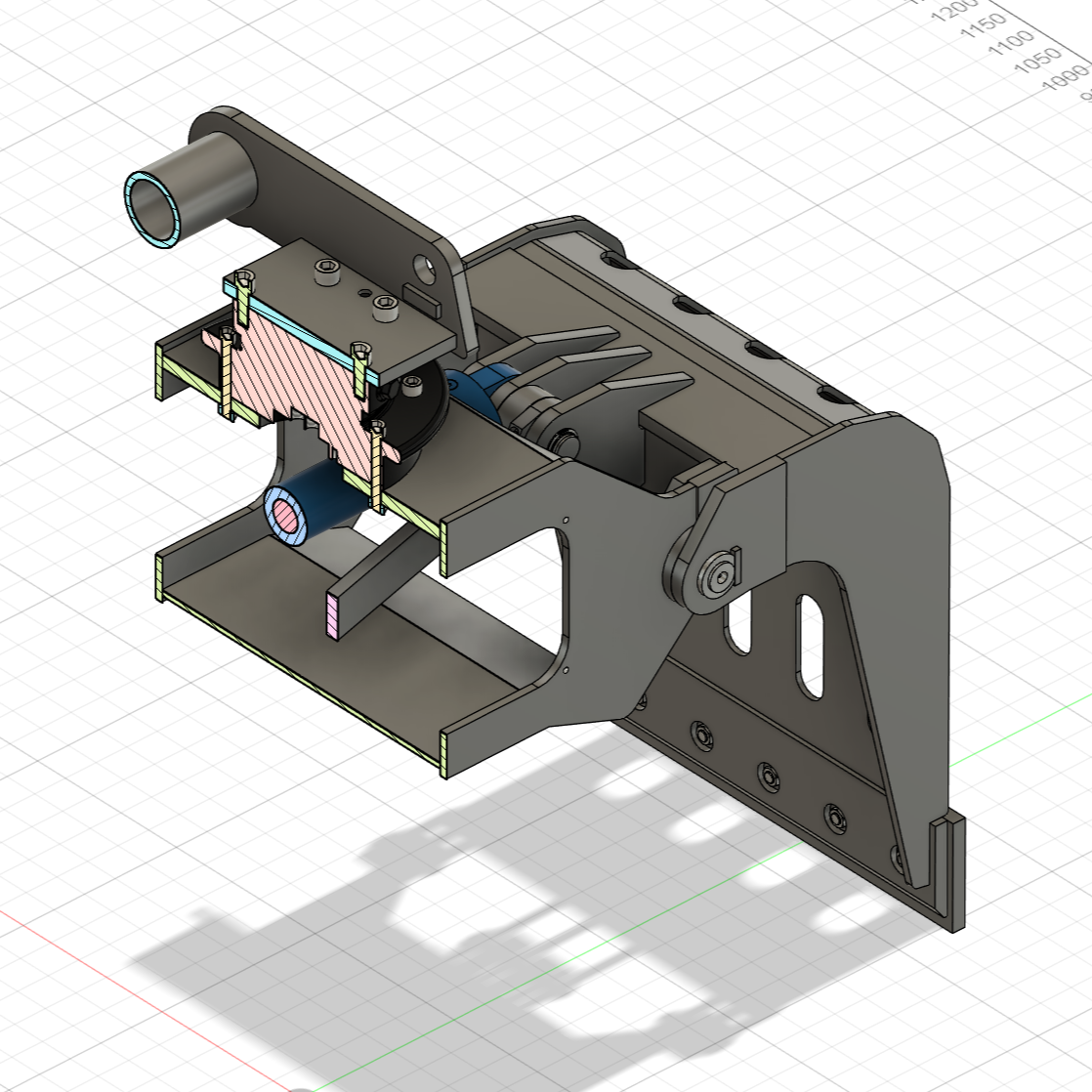 Für einen Terex TW85 Mobilbagger wurde ein Sortiergreifer vollständig konstruiert. Im Rahmen des Projekts wurden umfangreiche analytische Berechnungen für Schrauben und Bolzen durchgeführt. Die Bolzenverbindungen erhielten Gleitlagerbuchsen, zusätzlich wurden Anlaufscheiben zur Aufnahme axialer Belastungen vorgesehen.