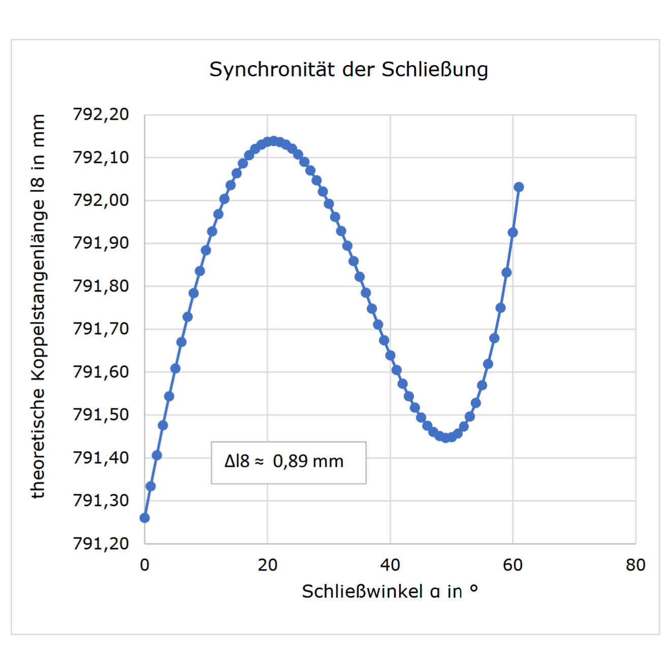 Zur Berechnung der optimalen Schließkinematik wurde ein Python-Programm entwickelt. Die Schließung erfolgt über eine Koppelstange, welche beide Schalen an definierten Punkten verbindet. Die grundlegenden Formeln wurden aus trigonometrischen Beziehungen hergeleitet. Ziel war es, die optimalen Drehpunkte für Schalen, Koppelstange und Hydraulikzylinder zu bestimmen, bei denen die Schließkraft maximal wird. Gleichzeitig wurden weitere Kriterien – wie eine konstante Schließkraft über den gesamten Schließverlauf – berücksichtigt.