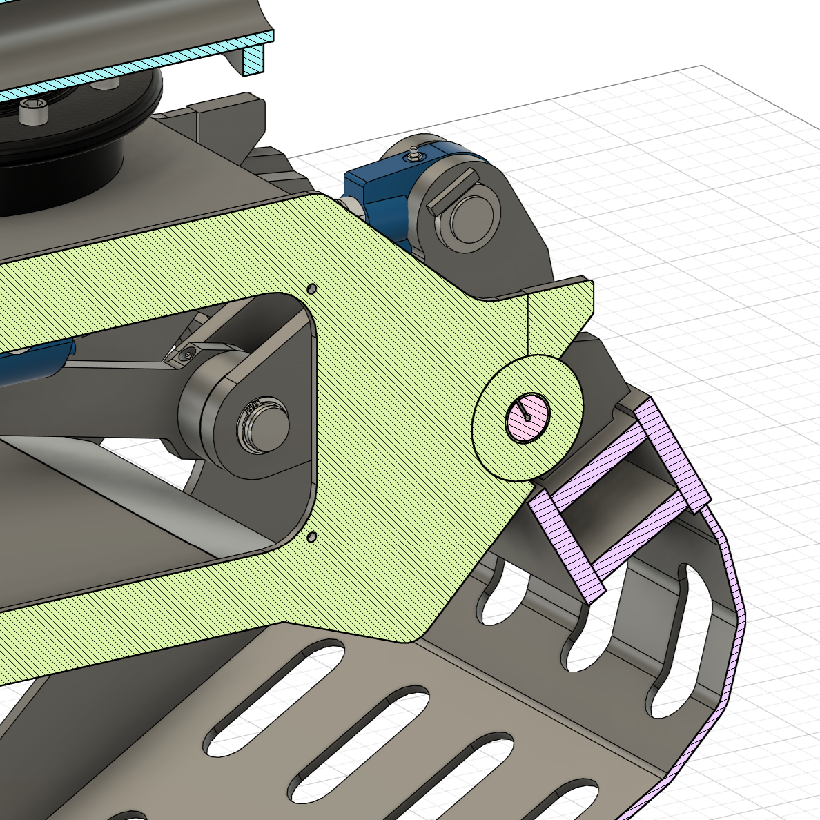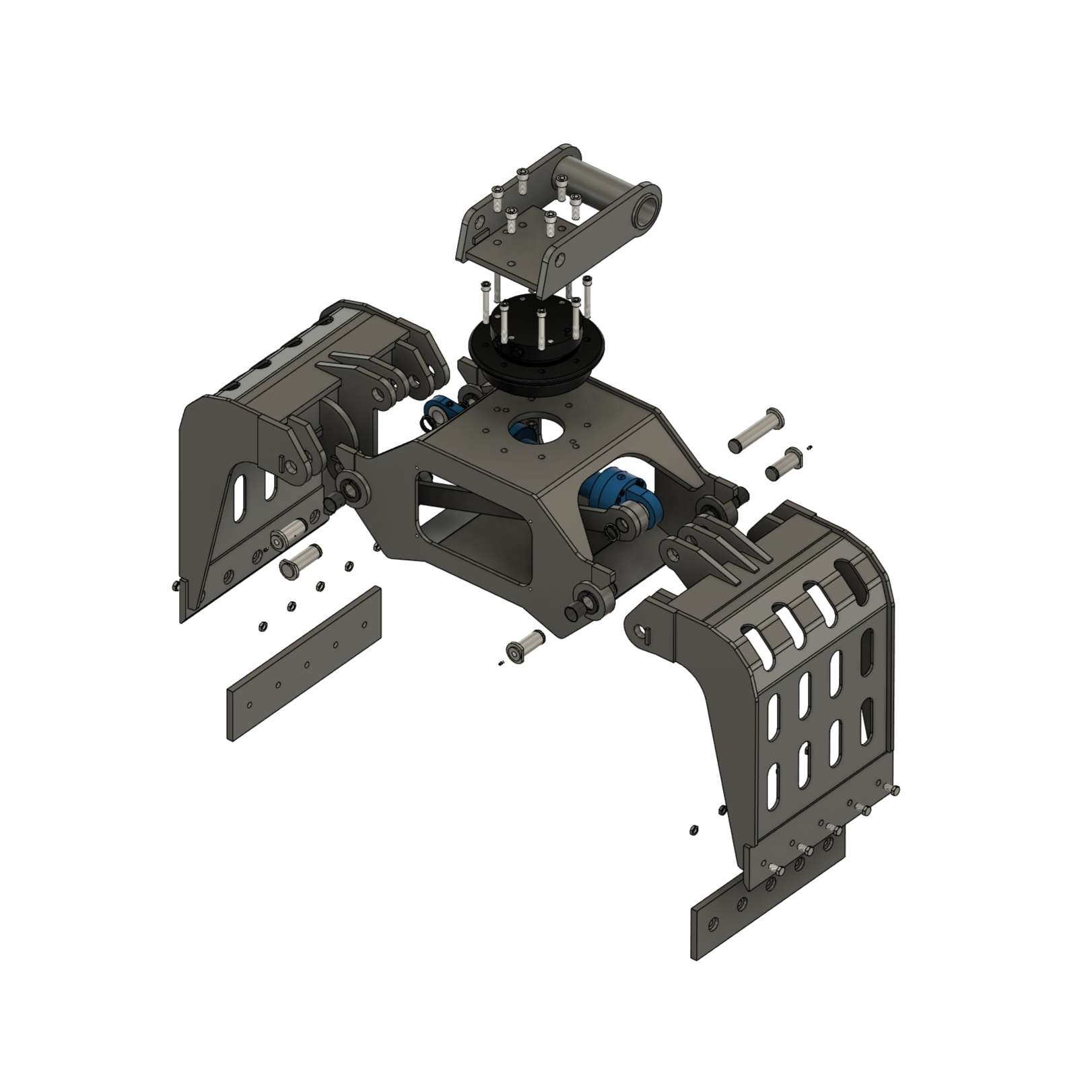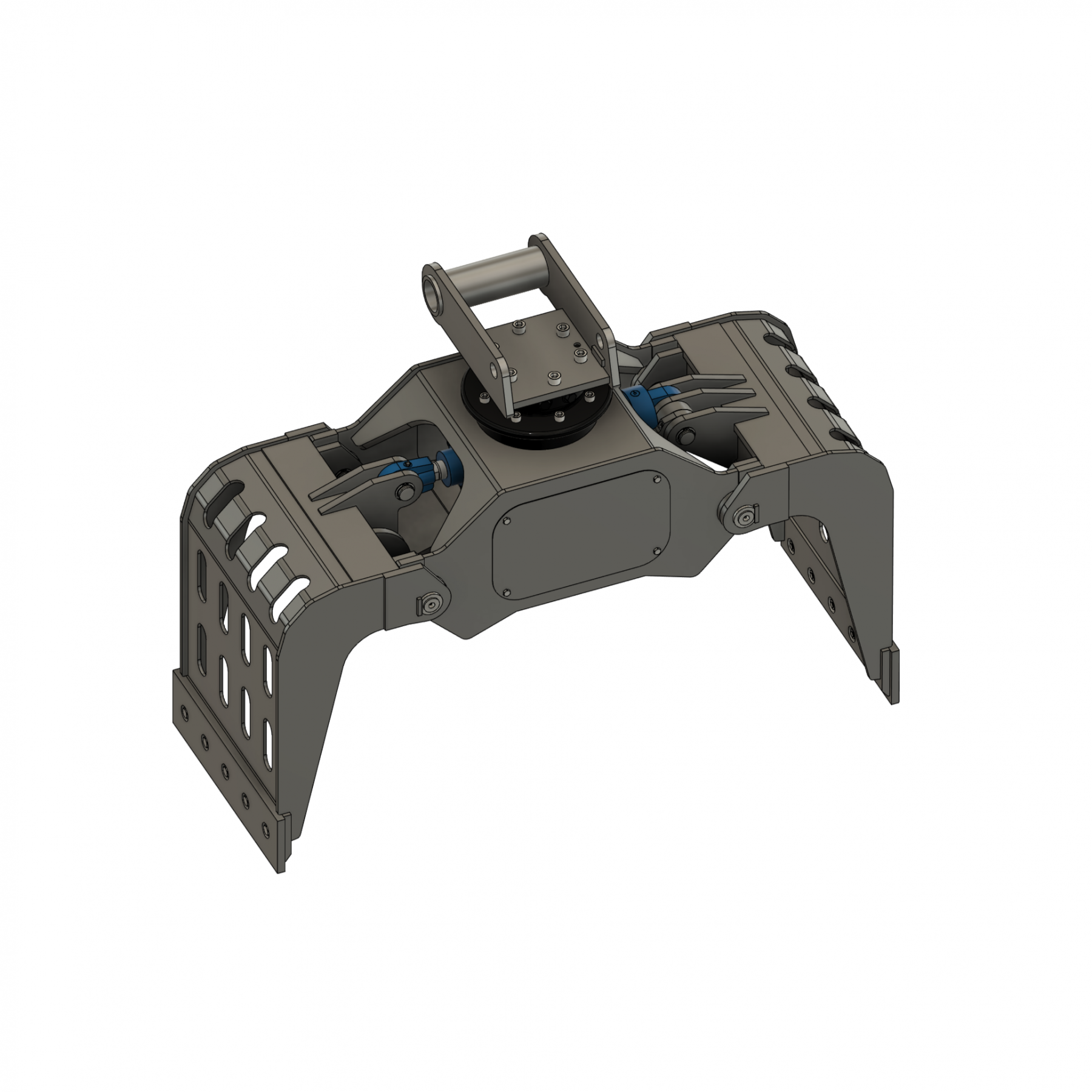 Rahmen, Koppelstange und Schalen wurden mittels FEM-Berechnungen optimiert und in der finalen Version validiert. Normteile wie Schmiernippel und Sicherungsringe wurden ausgewählt, außerdem ein passender Rotator und Hydraulikzylinder.
