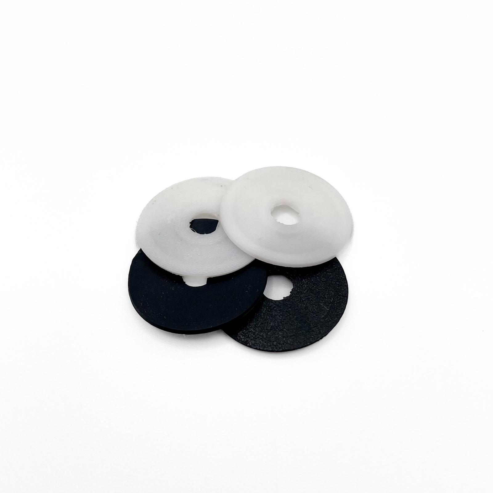 Unterlegscheiben können in verschiedensten Dimensionen konstruiert und gefertigt werden. Das verwendete Material ist für solche Anwendungen bestens geeignet und ist in Schwarz oder Weiß verfügbar.